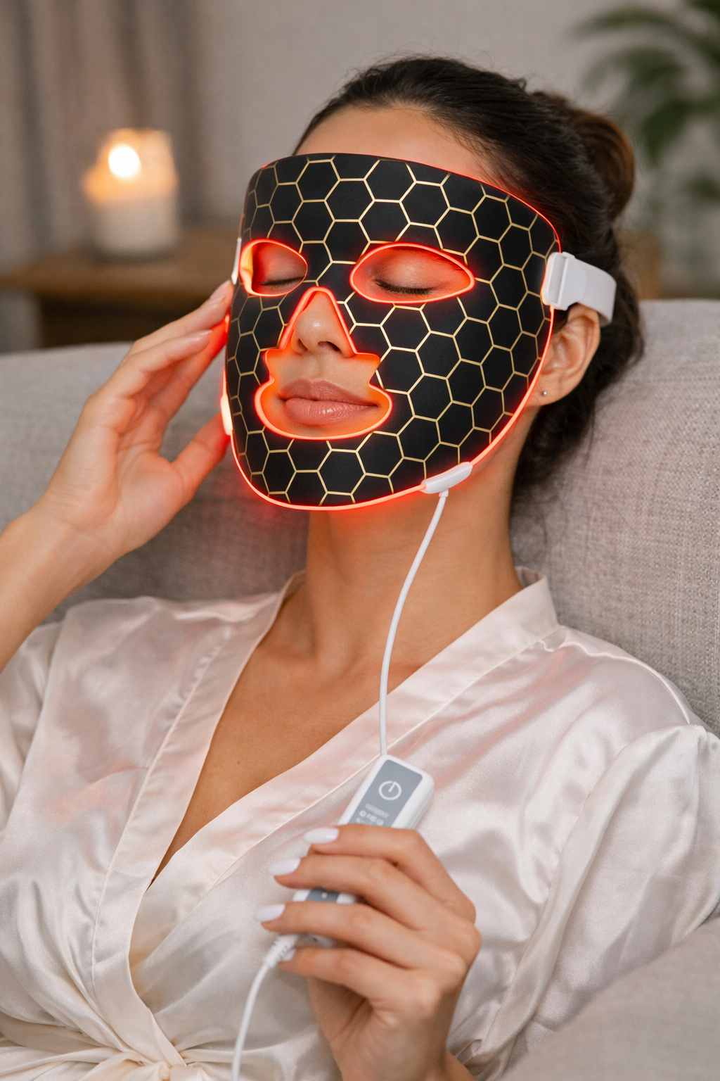 The device is shaped to fit comfortably over the face and is embedded with multiple LED lights that emit specific wavelengths known to stimulate collagen production, reduce inflammation, and promote cellular repair.